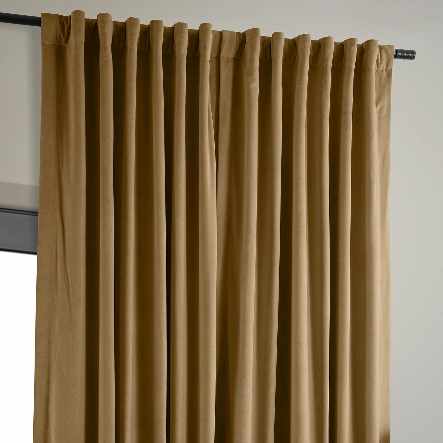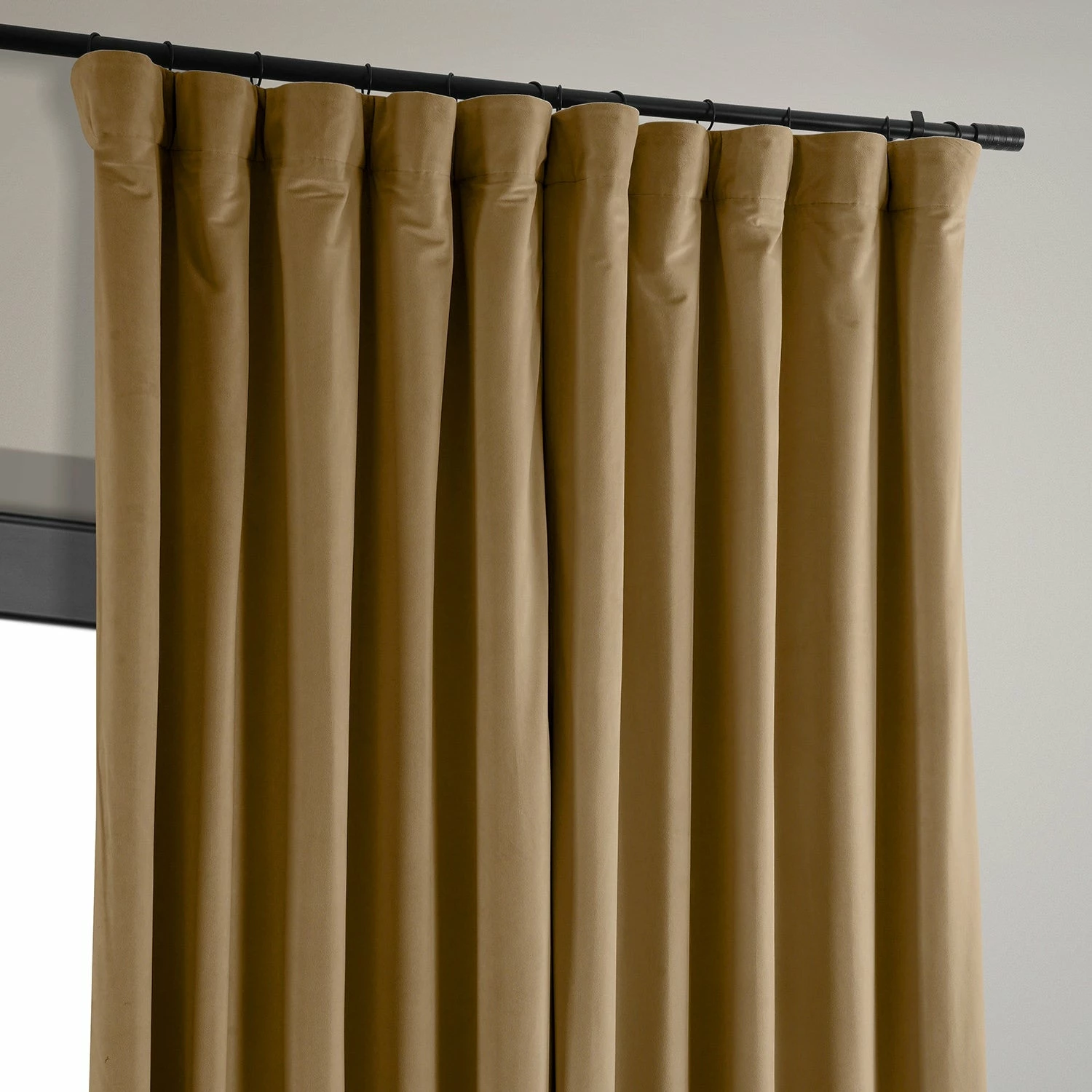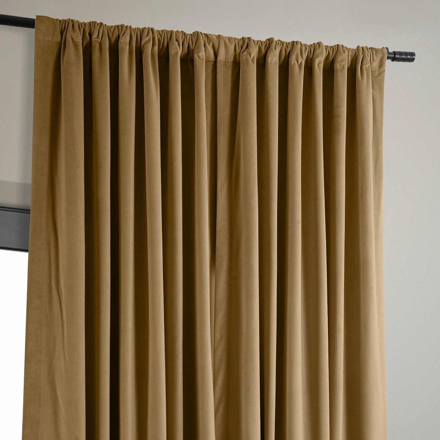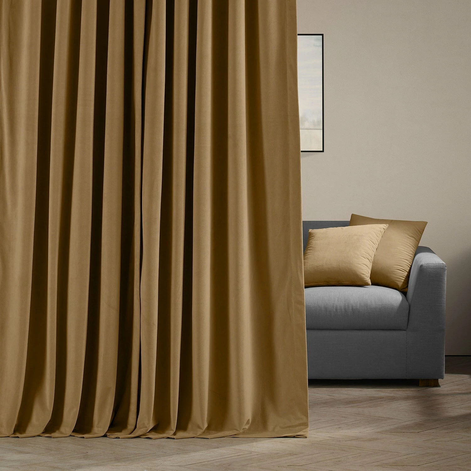 Complete a room with these velvet floor-length flowing extra-wide curtain panels, available in a stunning amber gold color. These energy-efficient curtains feature a blackout lining, which blocks out light and keep in the warm or cold air.