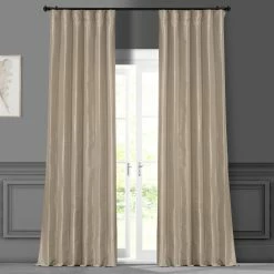 Revive your windows or French doors with this faux-silk taffetaantique beige curtain panel from EFF. Designed with riod pocketsfor easy installation and featuring a cotton and flannel lining forextra insulation year round, this curtain panel is both functionaland beautiful.