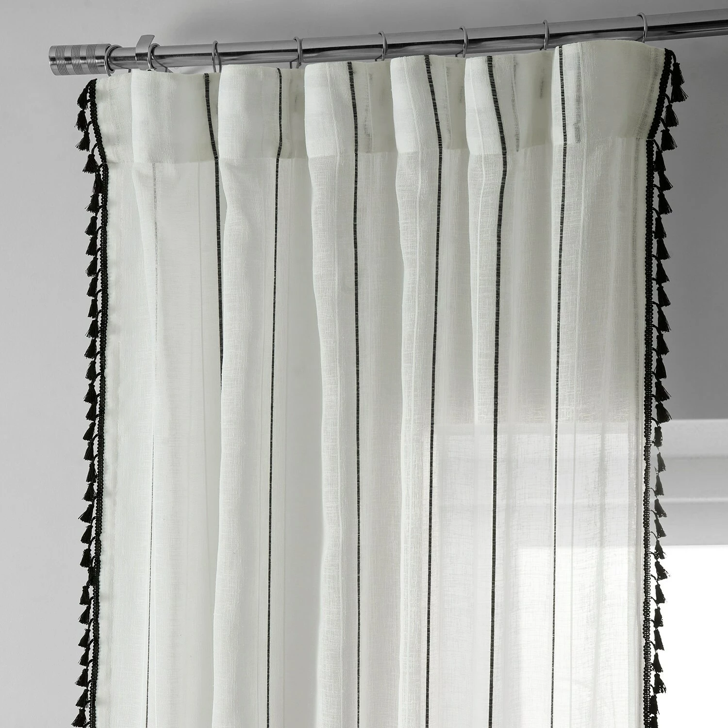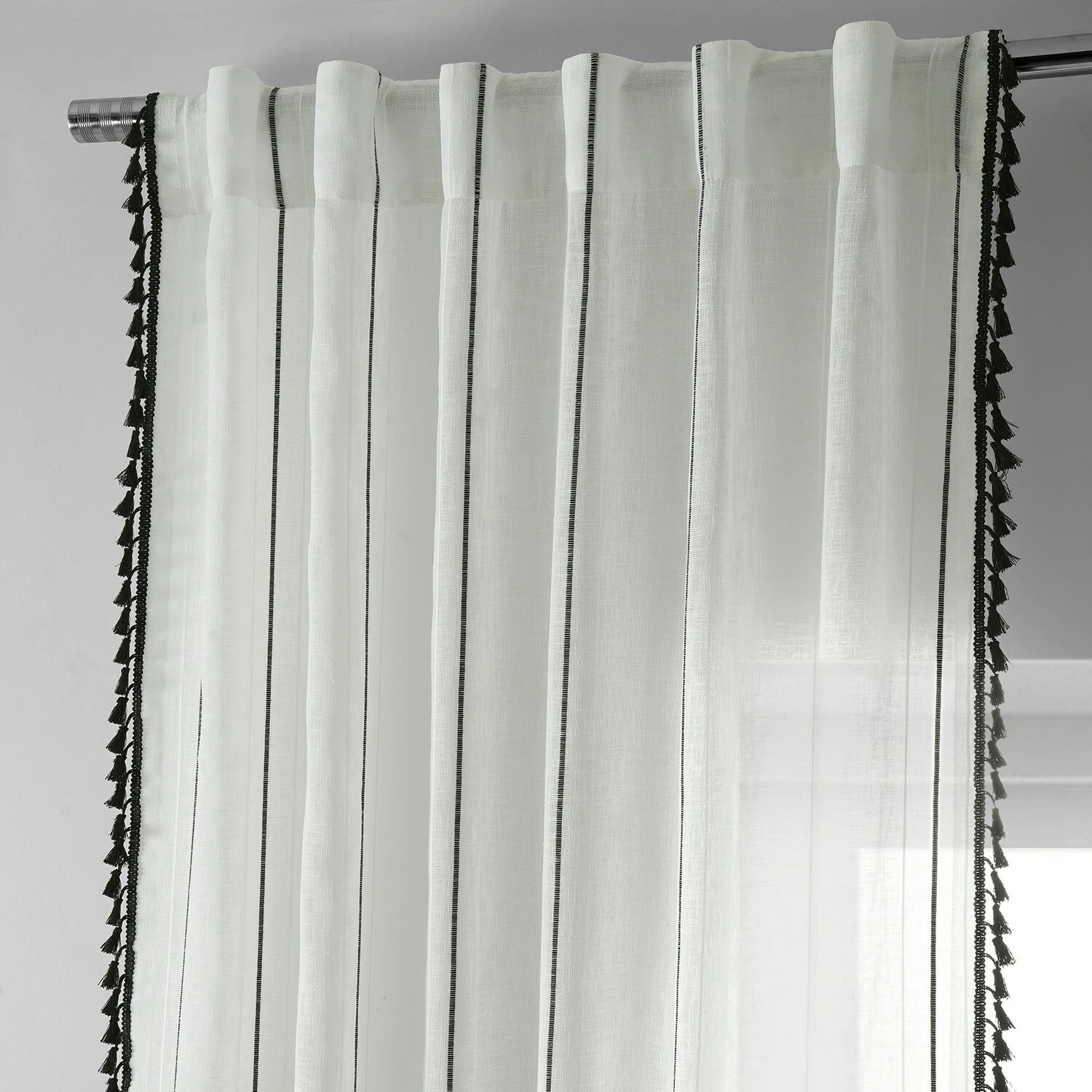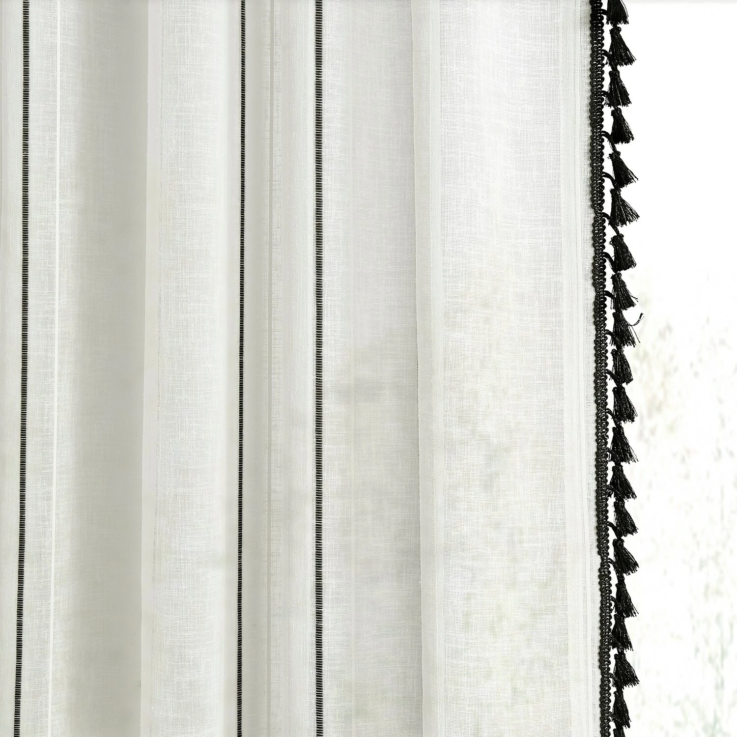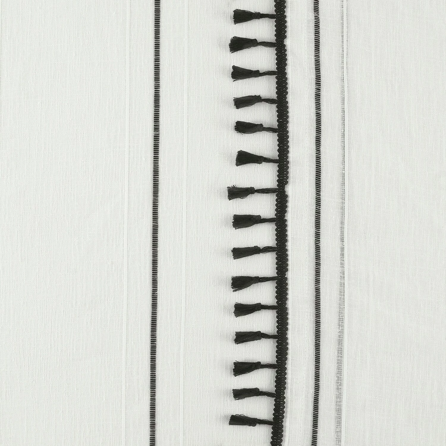 Campane is a classy unlined linen-like white semi-sheer curtain to create an ethereal atmosphere. Woven design detailing features an exquiste black pinstripe between two white stripes. The classic black bell-shaped tassle fringe is harmonious textural interest to emphasis length height and its modern twist. Easy to hang pole pocket with hook belt and back tabs.