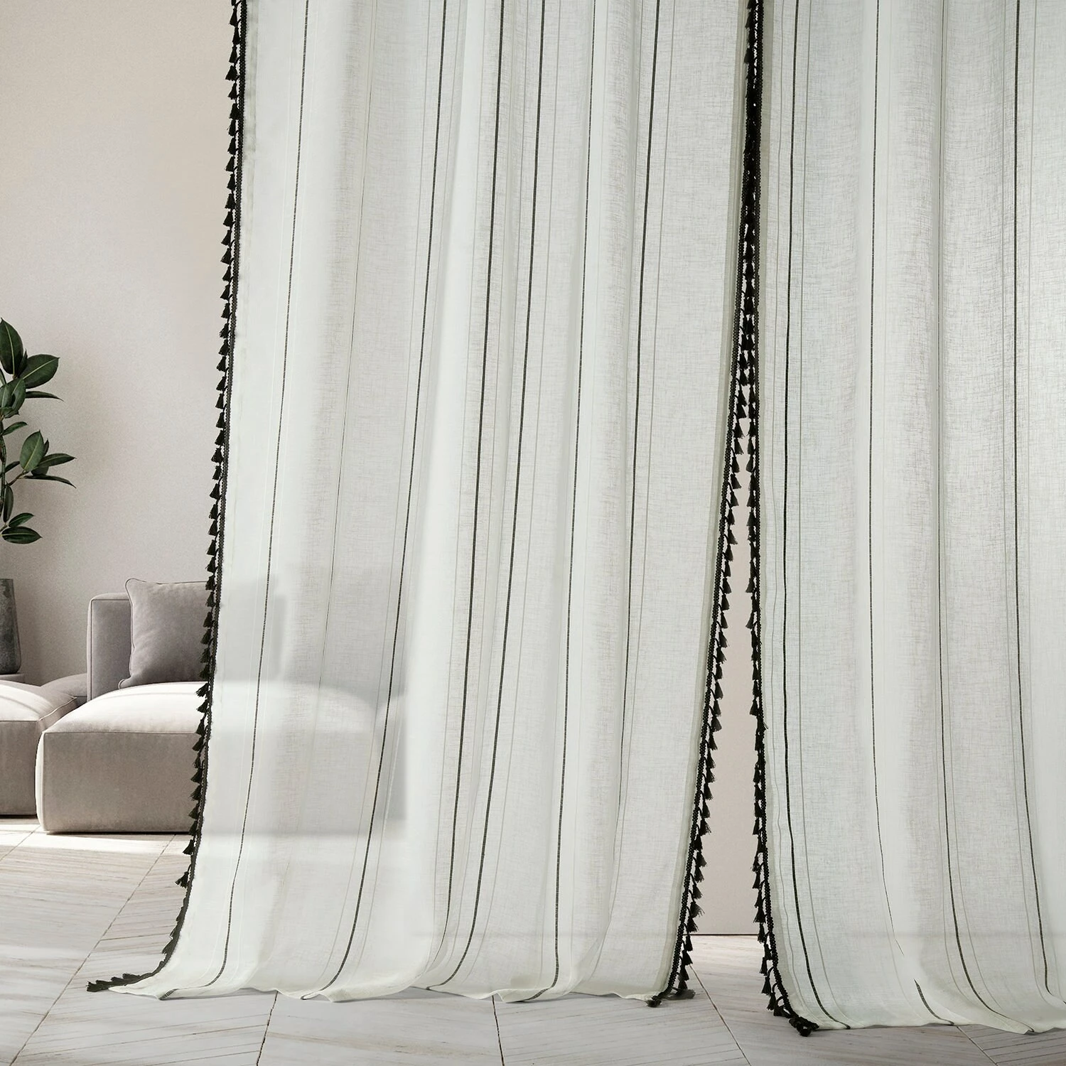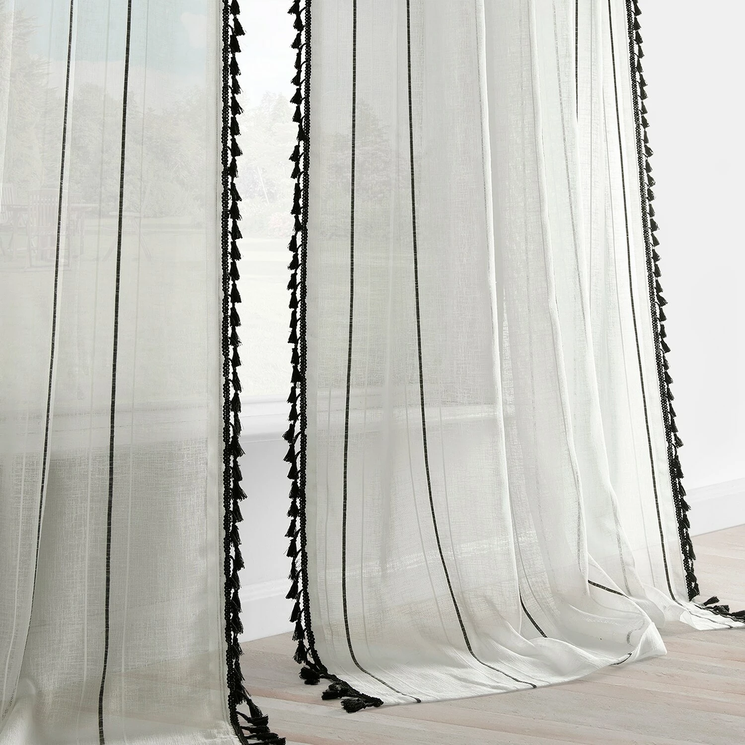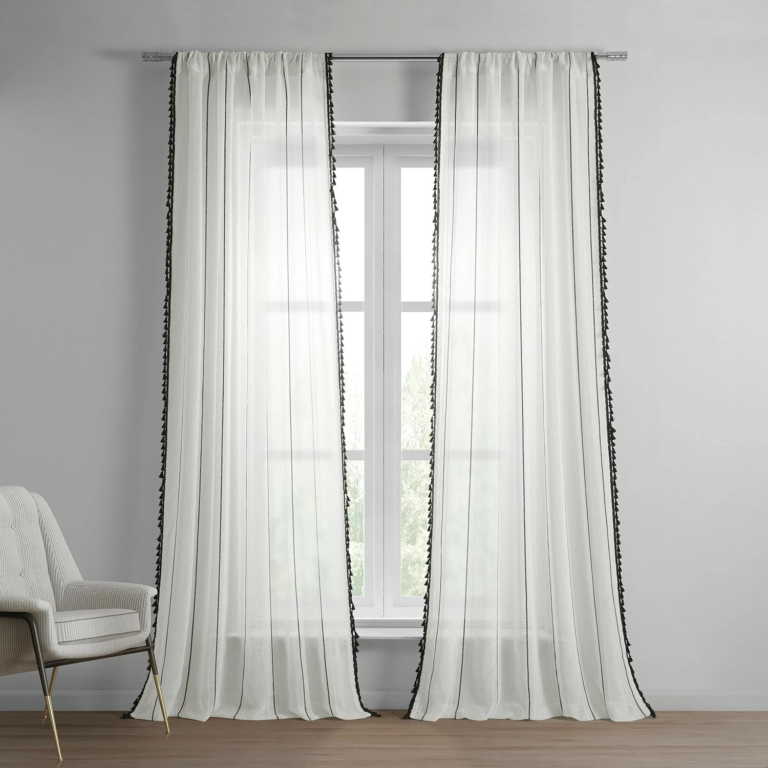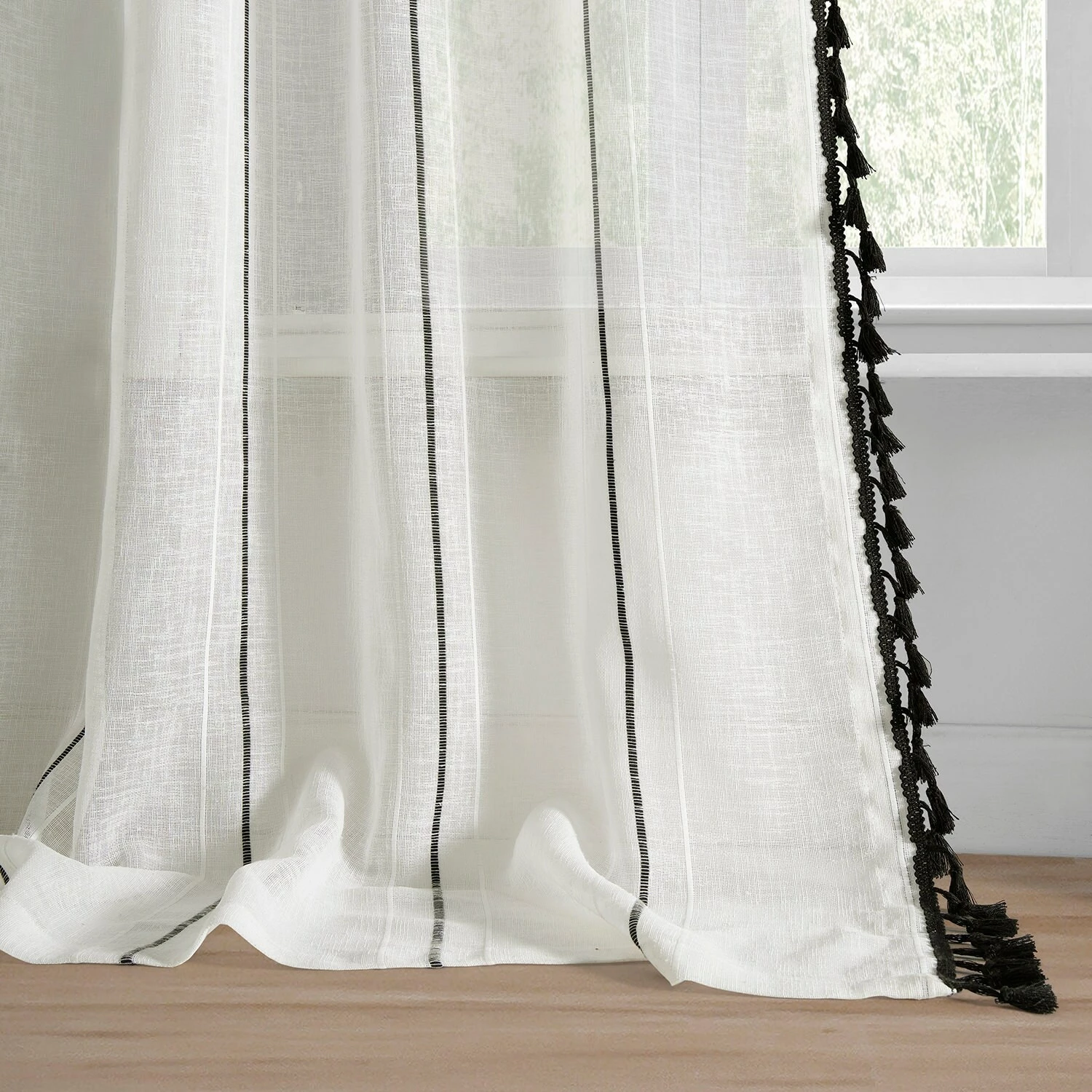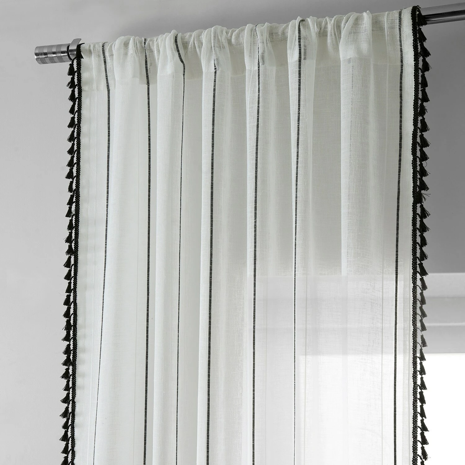 Campane is a classy unlined linen-like white semi-sheer curtain to create an ethereal atmosphere. Woven design detailing features an exquiste black pinstripe between two white stripes. The classic black bell-shaped tassle fringe is harmonious textural interest to emphasis length height and its modern twist. Easy to hang pole pocket with hook belt and back tabs.