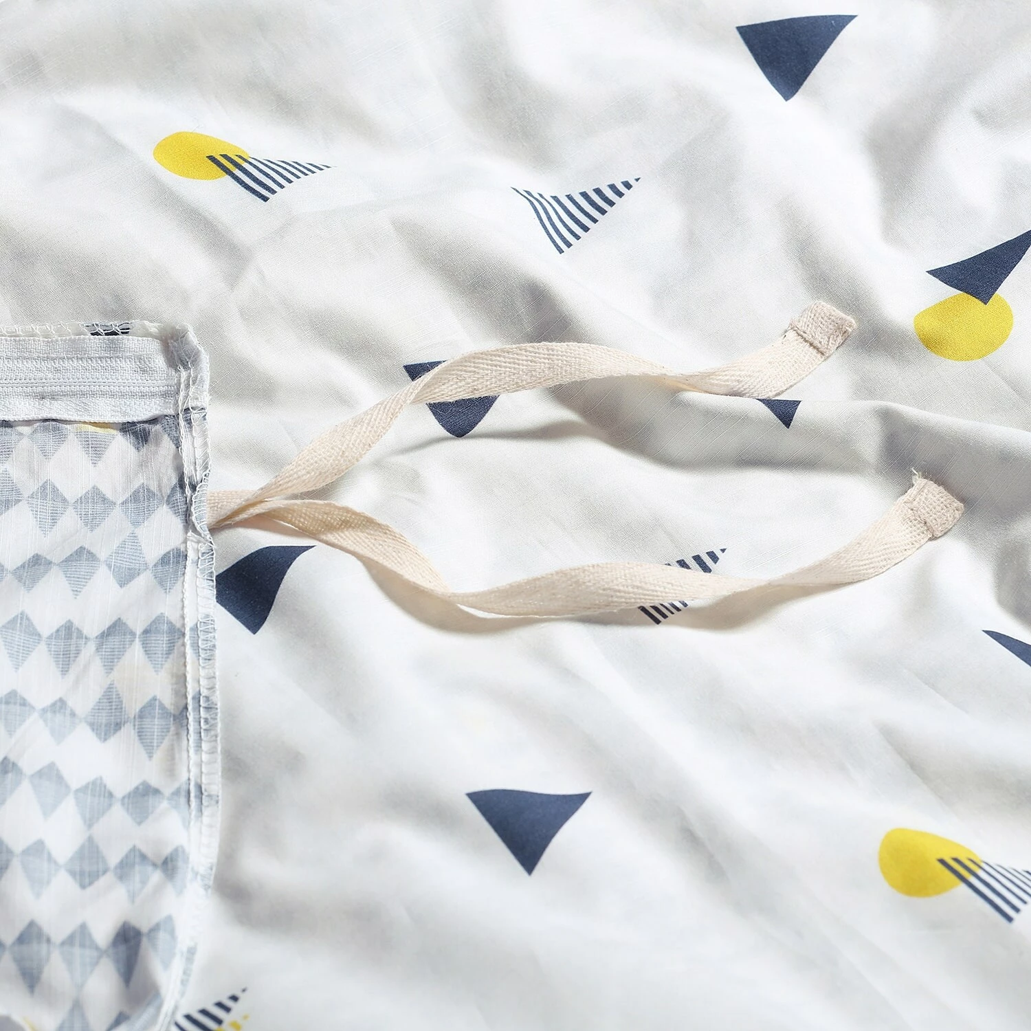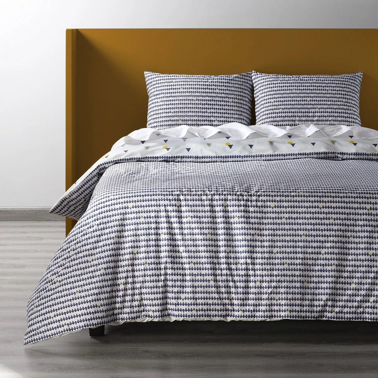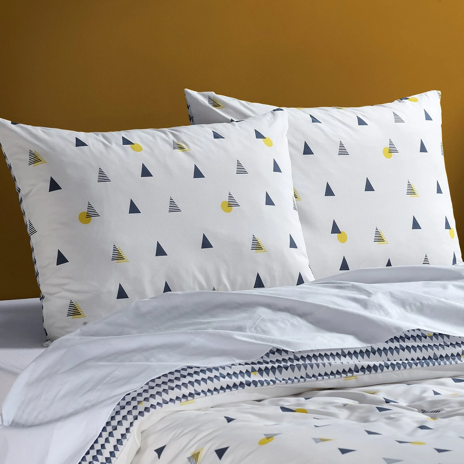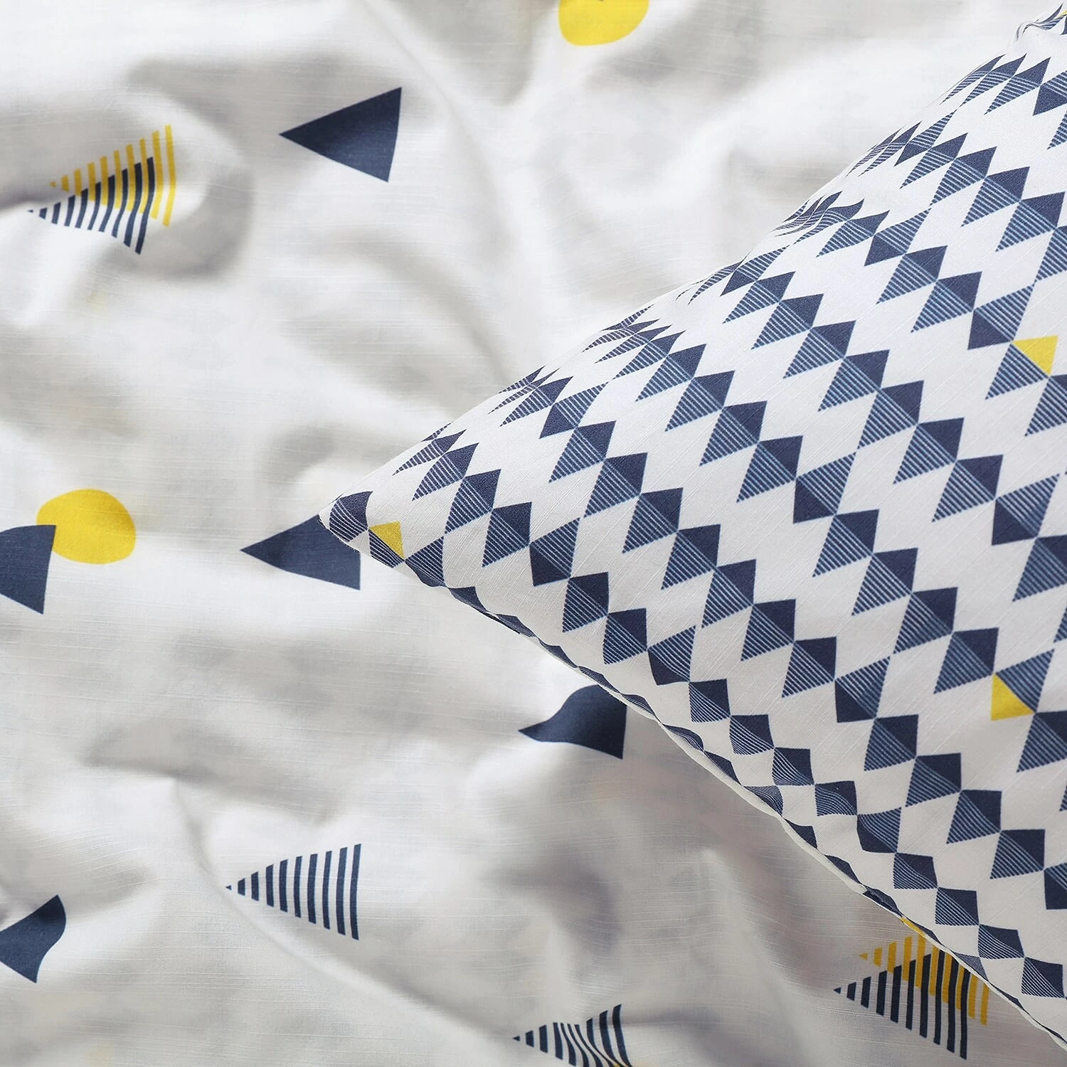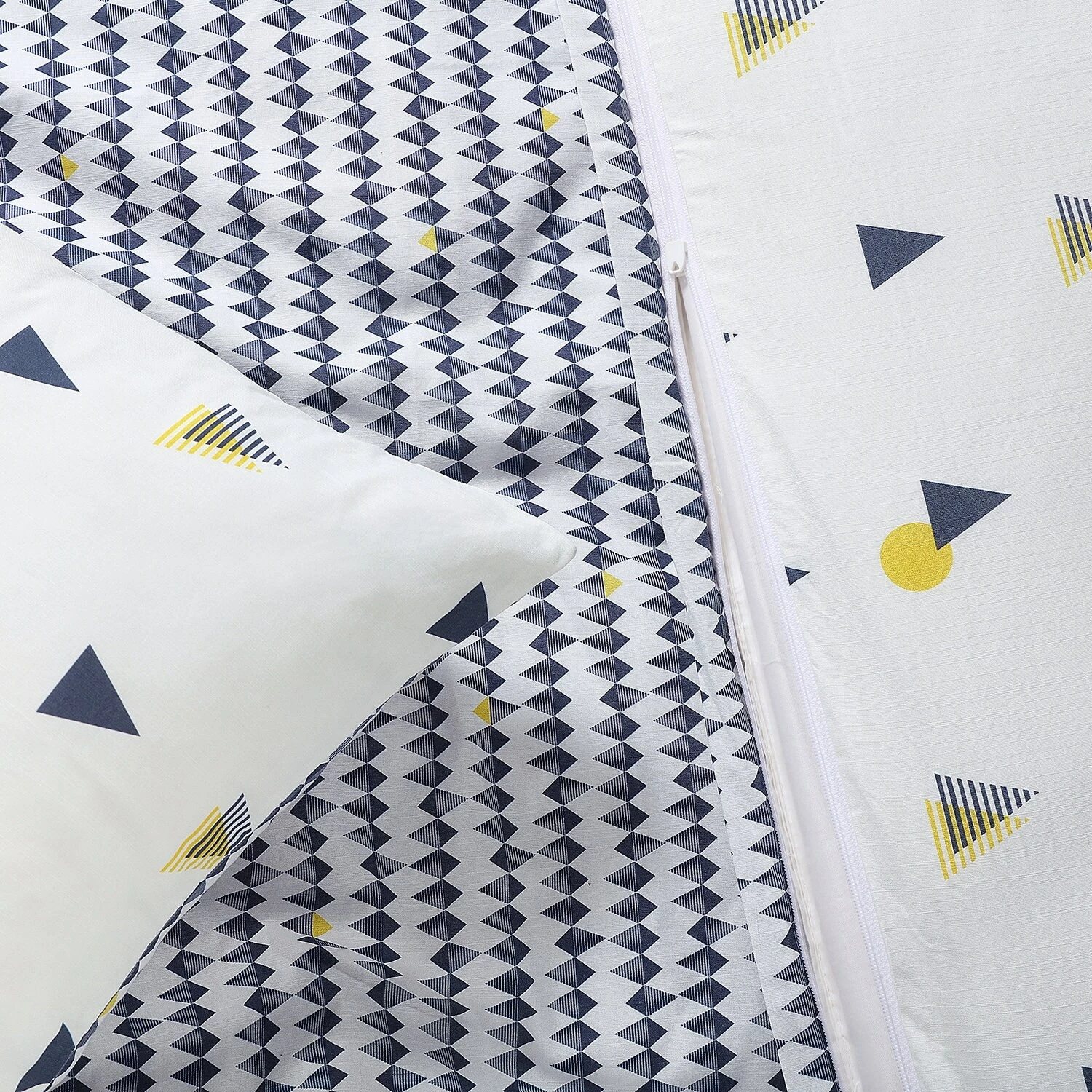 This mid-century modern pattern with its retro color scheme sets the standard for minimalist style with a touch of whimsy. Small multi colored triangles reverse to a linear multi colored design. Included in the set is one duvet cover and two shams featuring a knife edge finish, YKK zipper closures for the duvet cover and shams with interior ties to keep the duvet insert in place.
