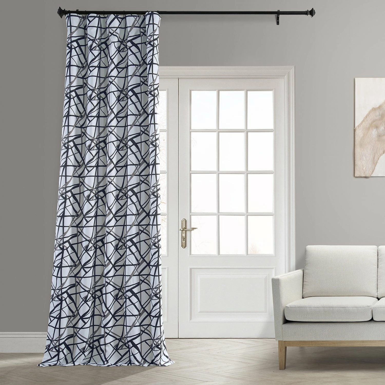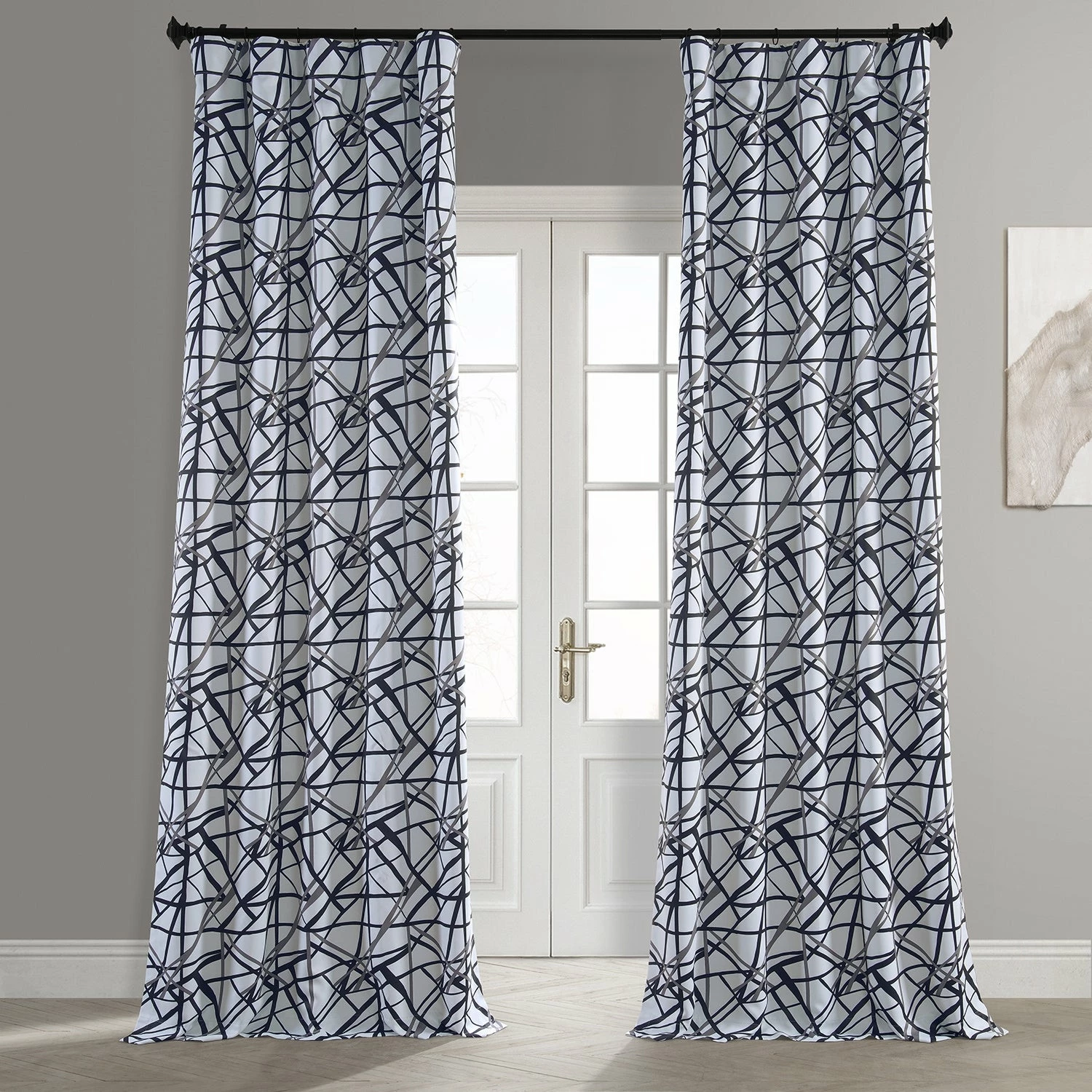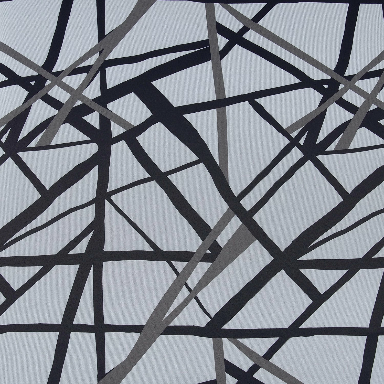 GRIDLOCK is a dynamic modern fretwork print. A large-scale intersecting double grid pattern. The bold black steel scaffold is the perfect stage to help make color accessories pop. This modern fretwork pattern is at work in a home-office space and equally at home in well-curated modern chinoiserie decor.