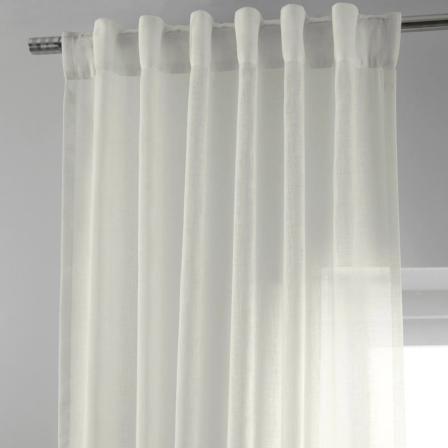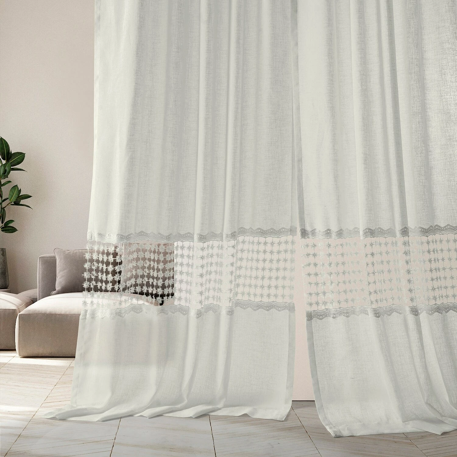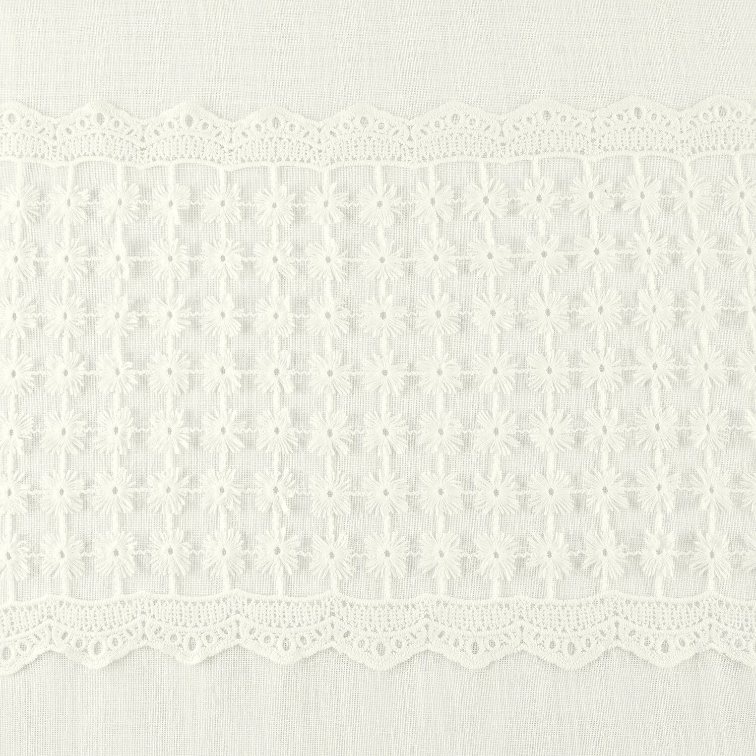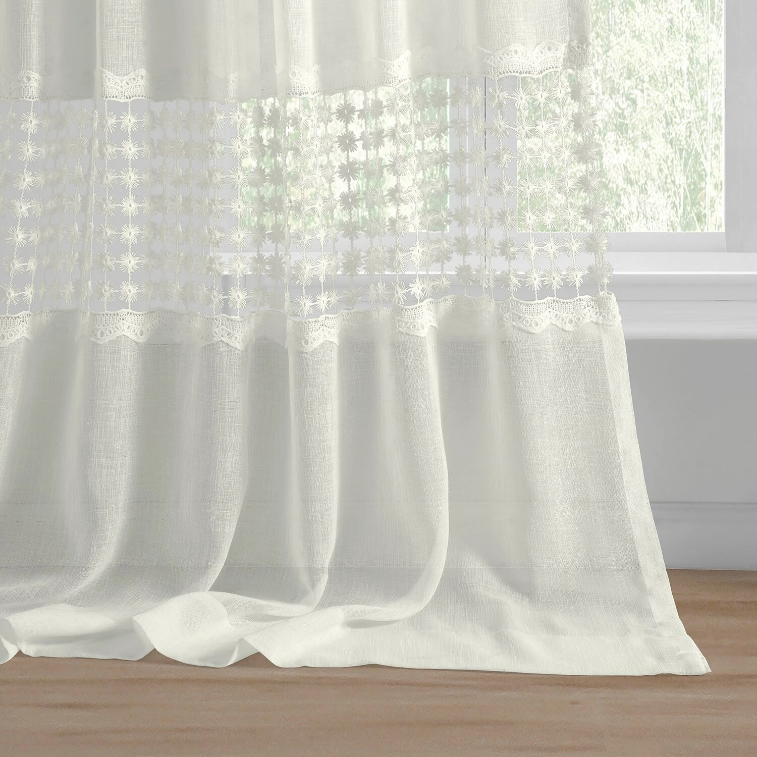 Lacy Daisy Off-White is a relaxed unlined gauzy semi-sheer curtain to create a flirty atmosphere. The lovely daisy lace border insert is a peek-a-boo textural contrast to emphasis width and innocent styling. Easy to hang pole pocket with hook belt and back tabs.