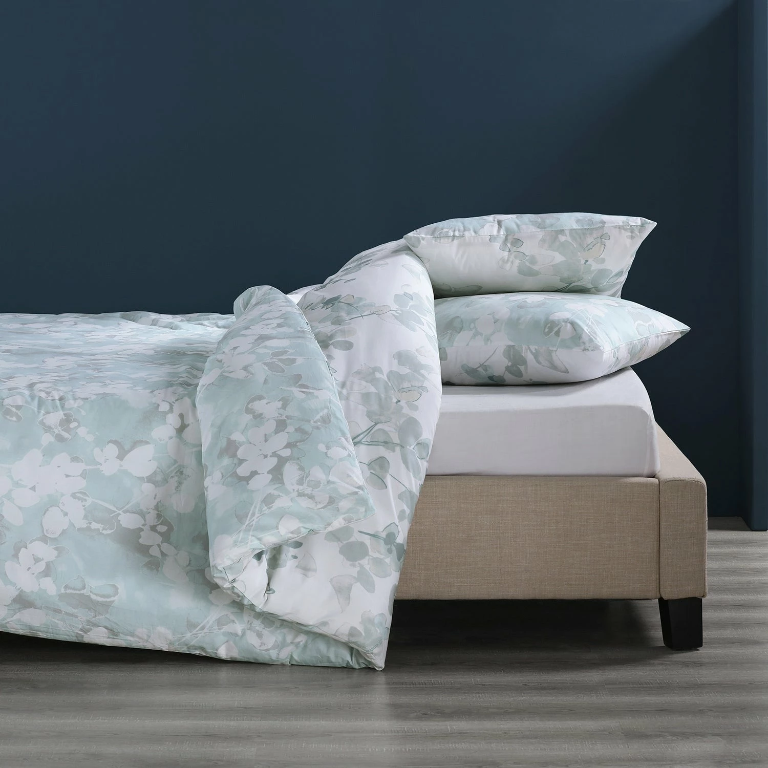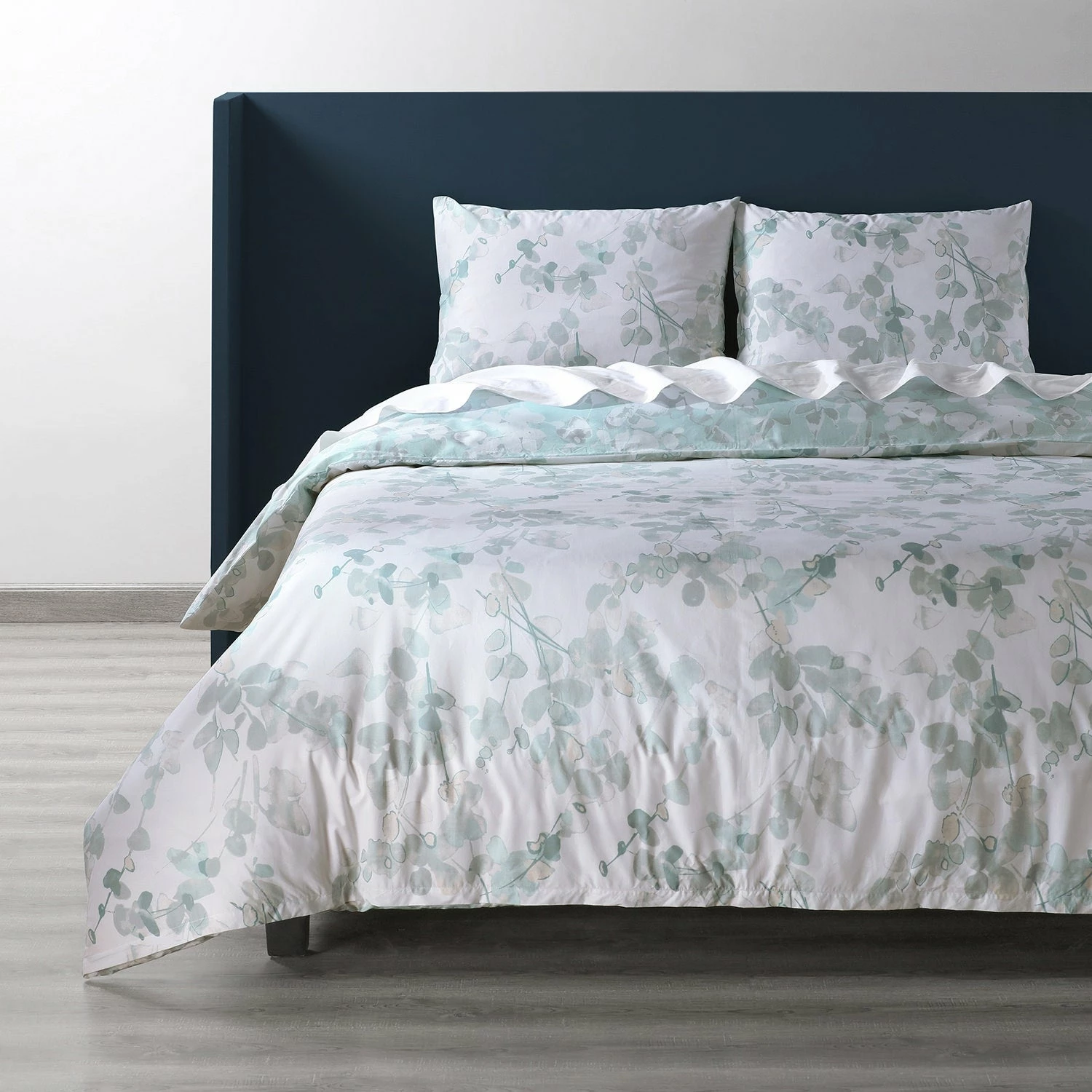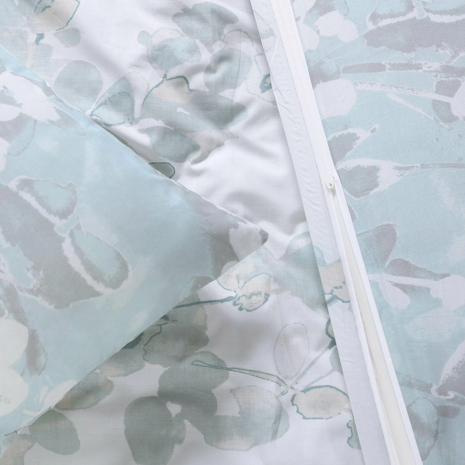 Stylized soft white and grey branches spread across a pale, blue grey field giving this Duvet set a captivating vintage charm. The light grey field reverses to the opposite colorway for versatility and styling options. Included in the set is one duvet cover and two shams featuring a knife edge finish, YKK zipper closures for the duvet cover and shams with interior ties to keep the duvet insert in place.