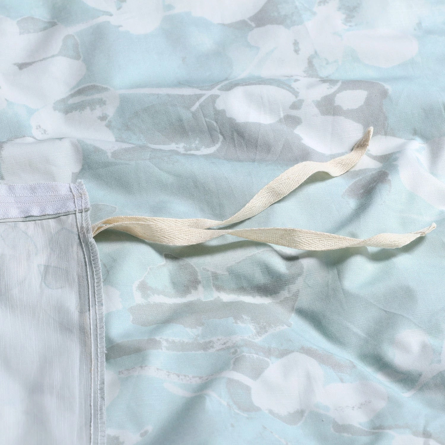 - Zipper closures on duvet cover and pillow shams with four corner ties