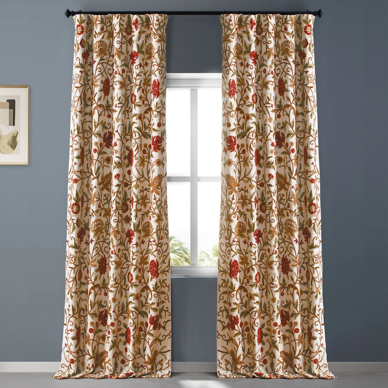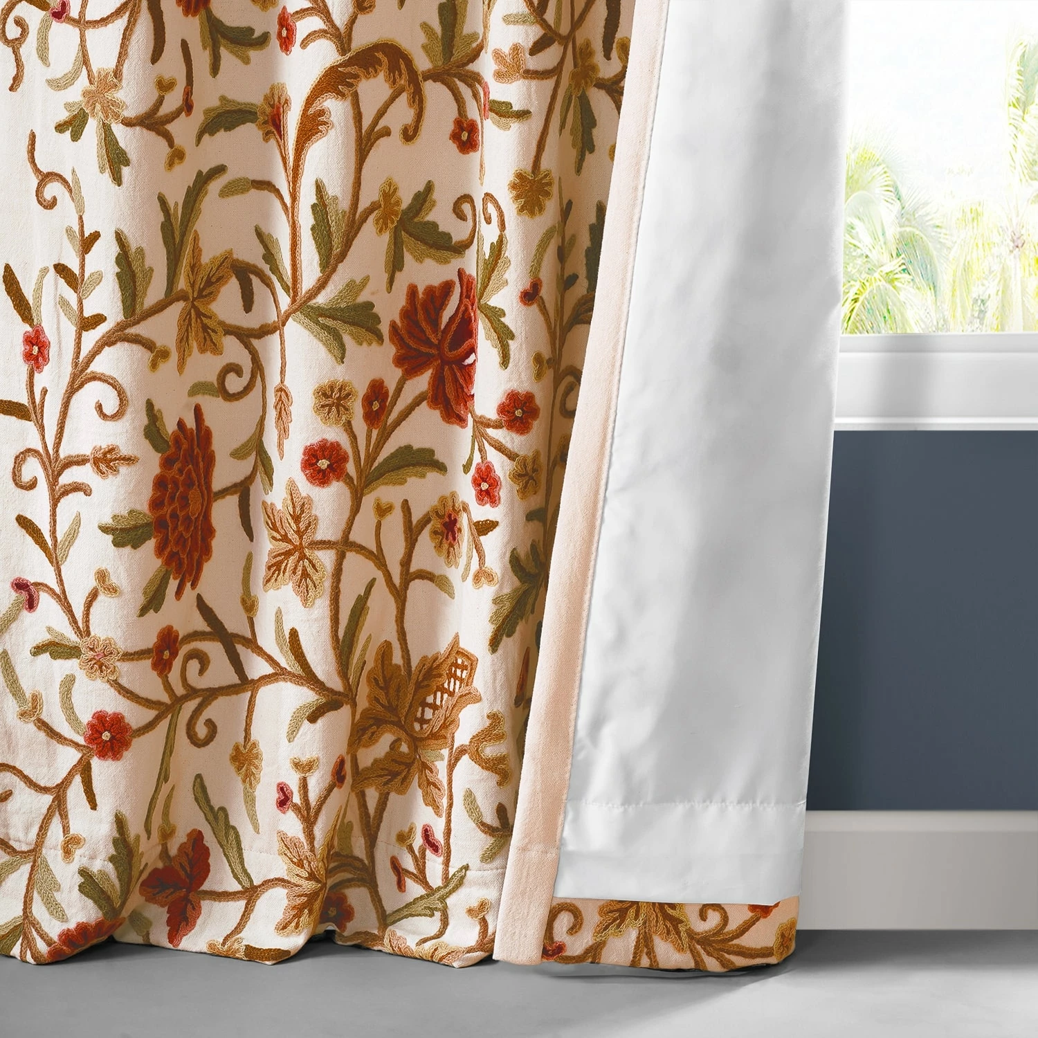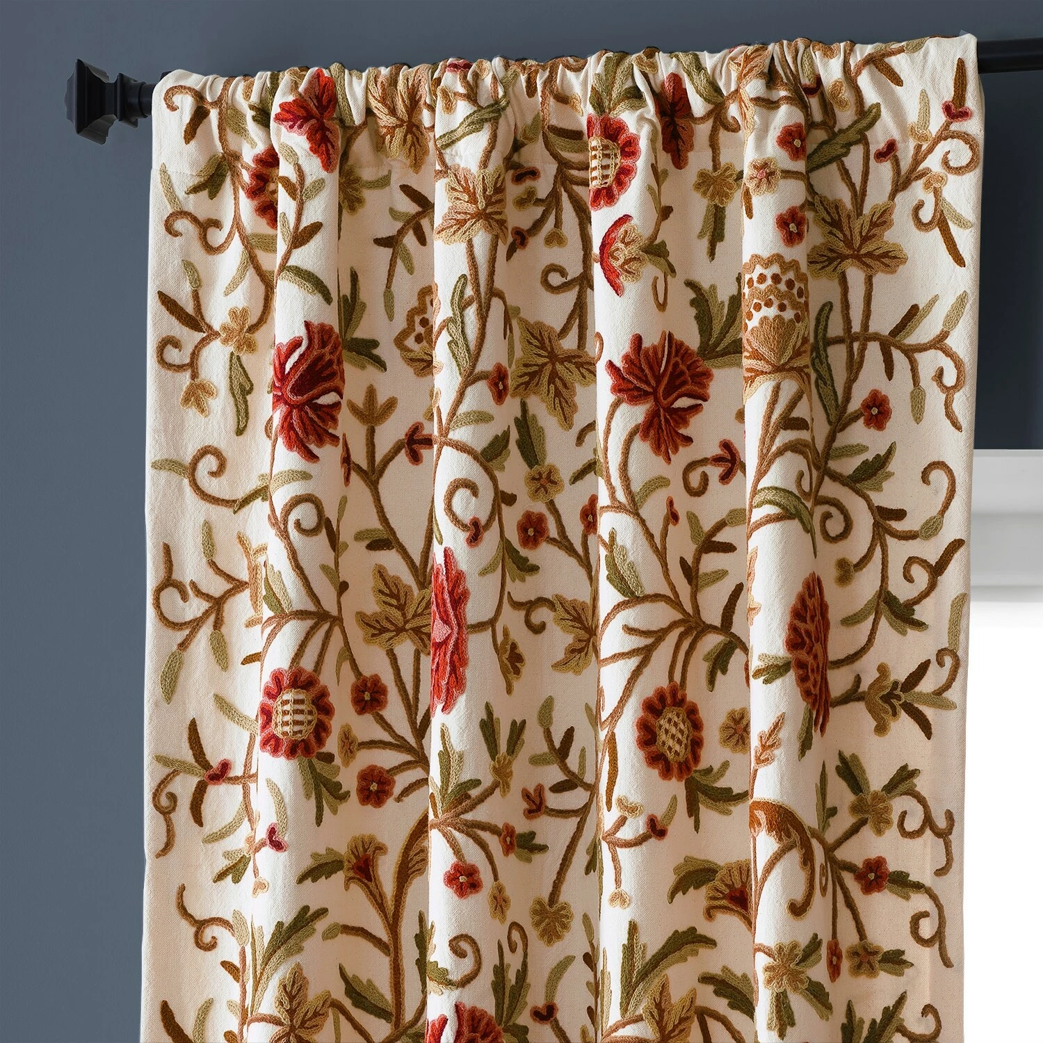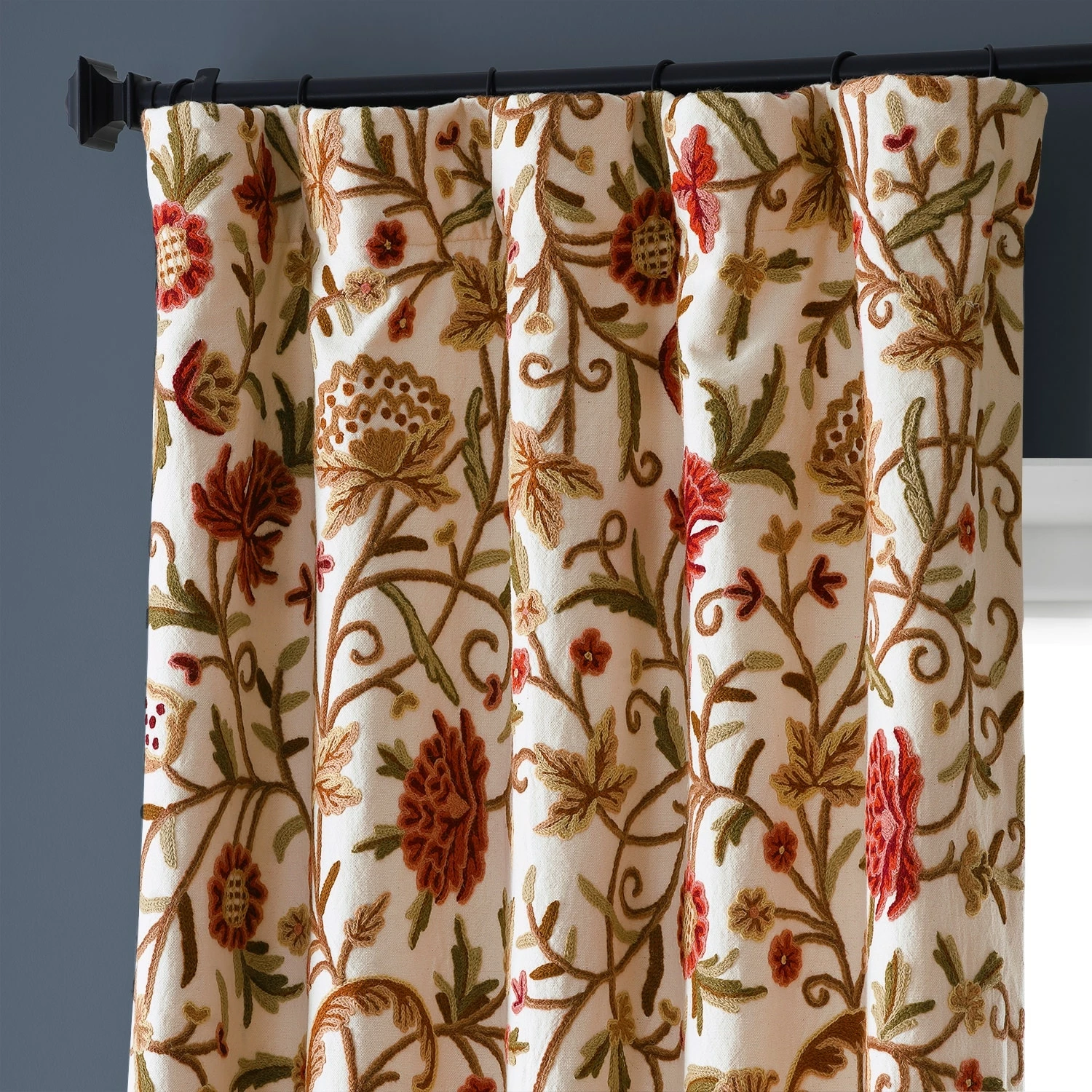 Decorate your windows with this luxurious embroidered curtain from Exclusive Fabrics. Hand-embroidered for Old-World charm and unique one-of-a-kind details, this panel is lined to help reduce drafts, and it’s crafted from cotton and wool for a natural look and feel.