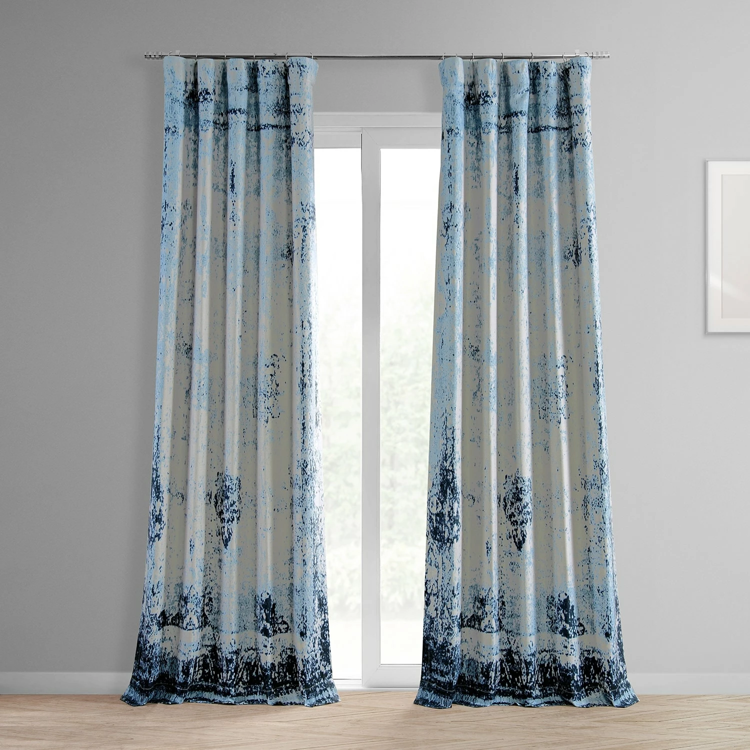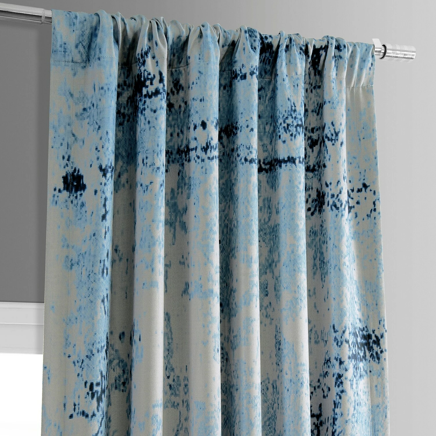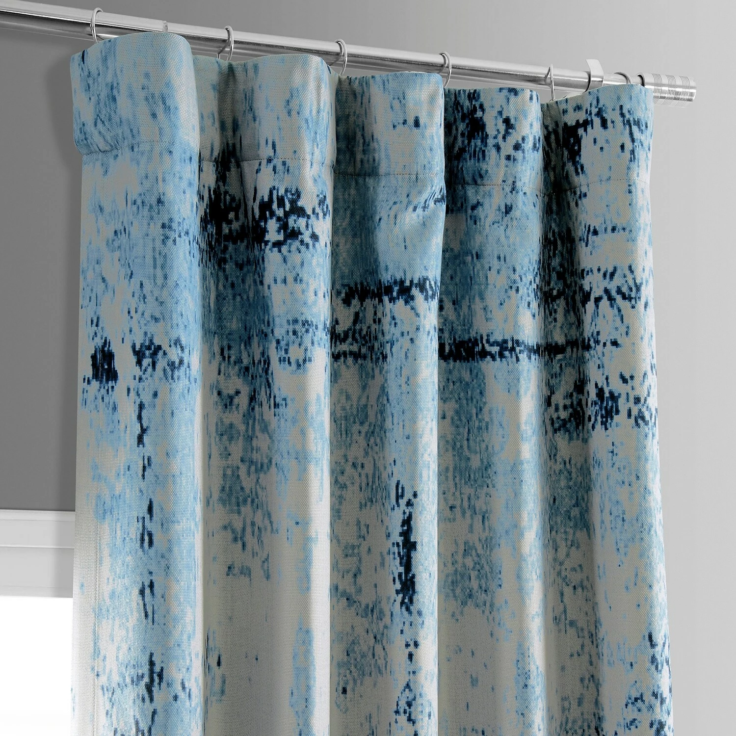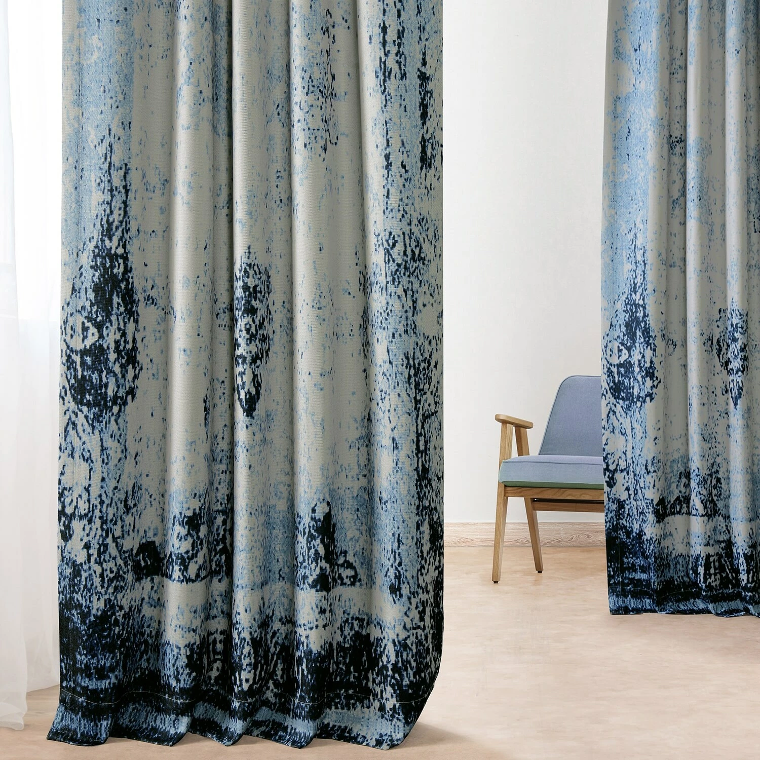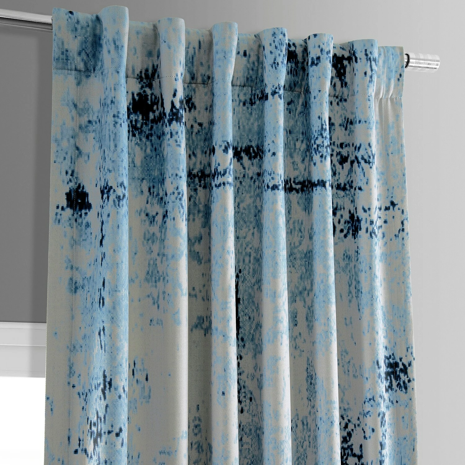 RAINDROPS print is a nature inspired tear-shapped abstract in layered indigo and classic blues on a white background. This linen-like curtain is unlined and backed with off-white fabric.
