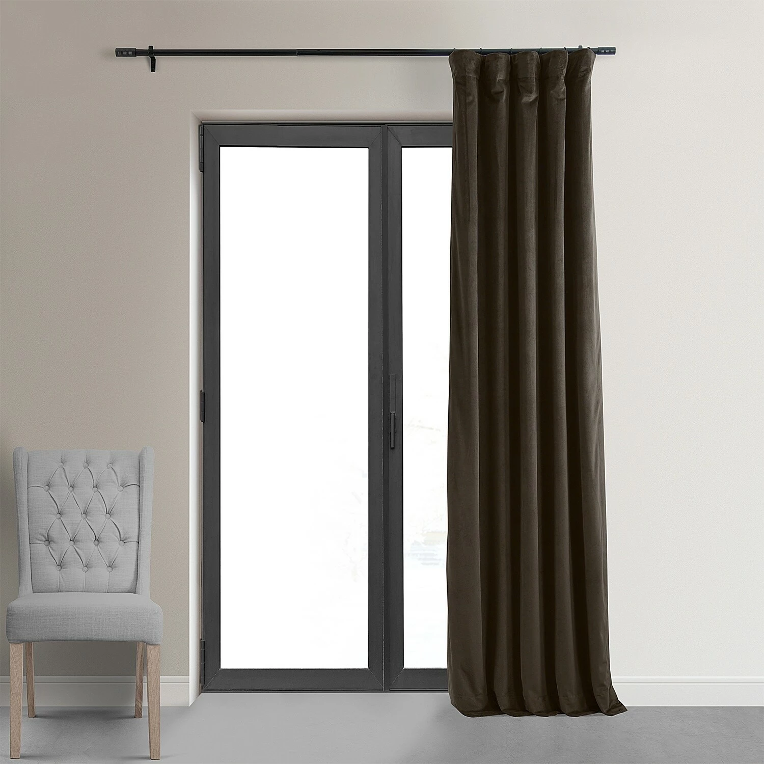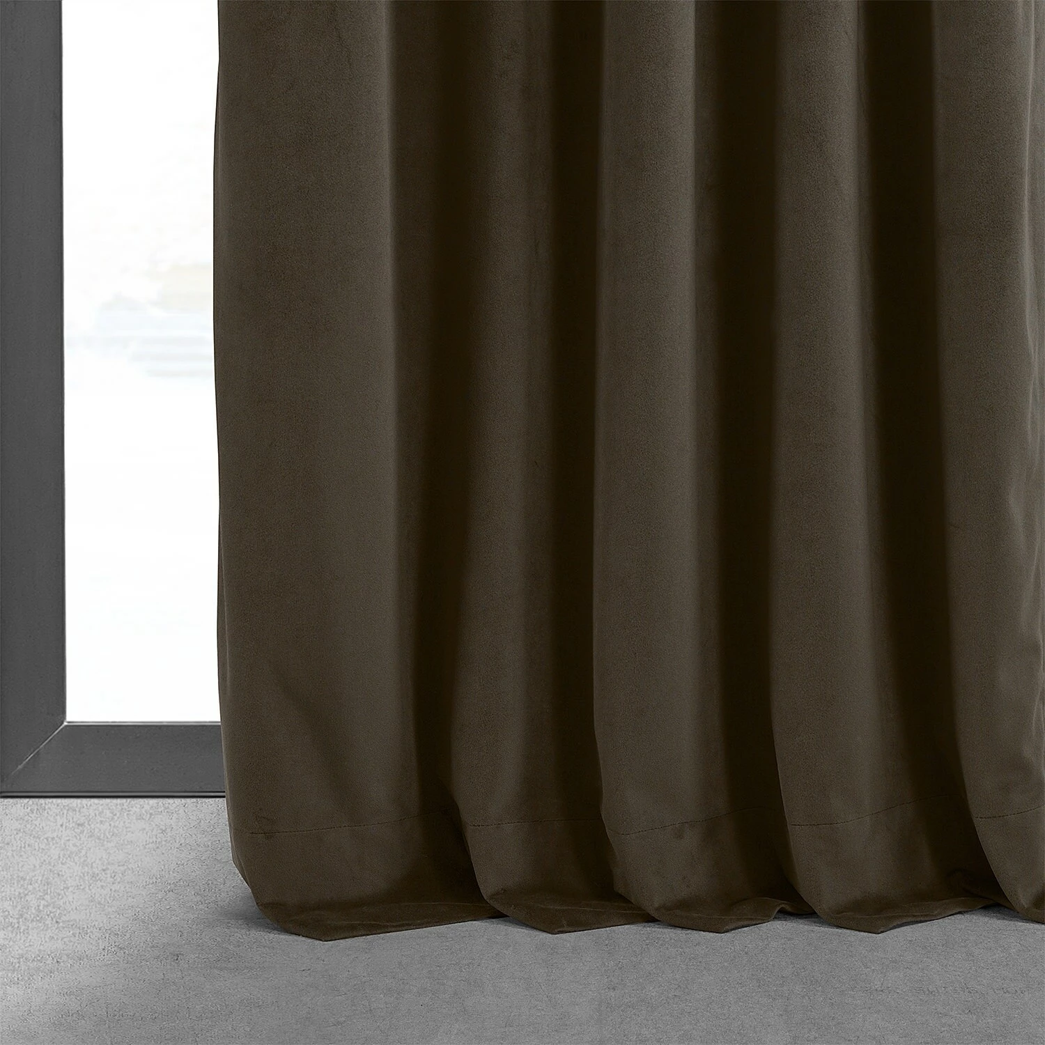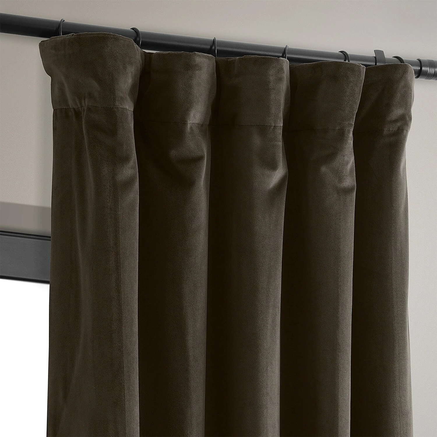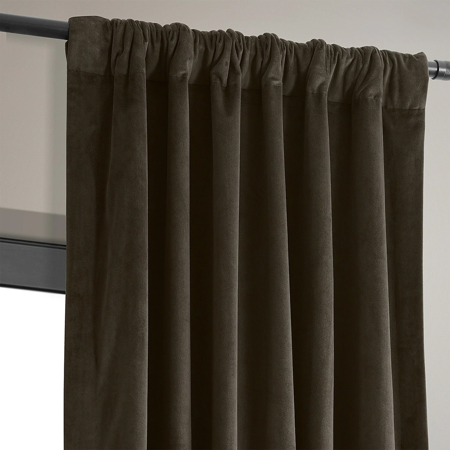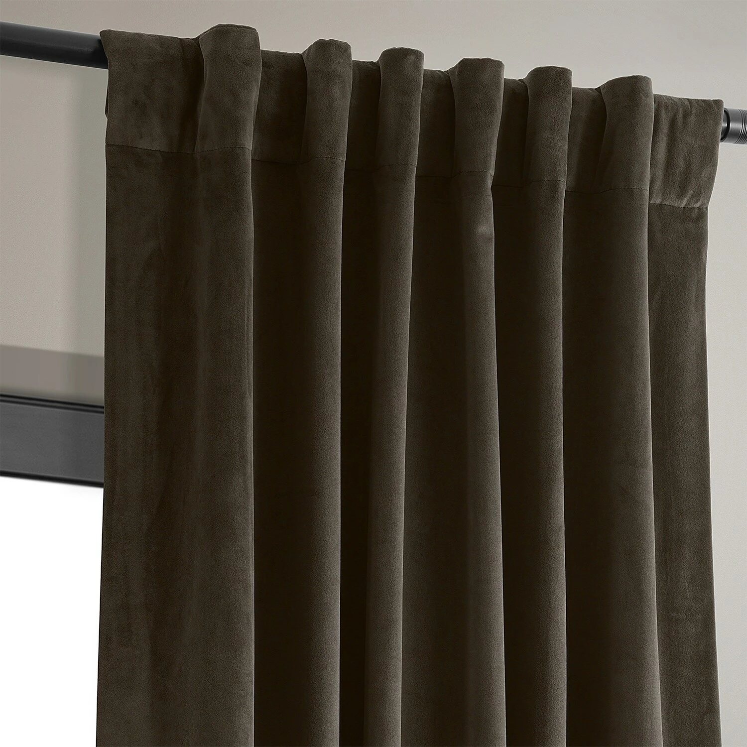 Block out heat and harsh sunlight with this curtain panel. Velvet fabric gives this curtain a lush, opulent look, while the soft brown color adds a note of warmth to your decor. Equipped with a rod-pocket header and back tabs for versatile display, this curtain helps lower your energy bills with its blackout lining.