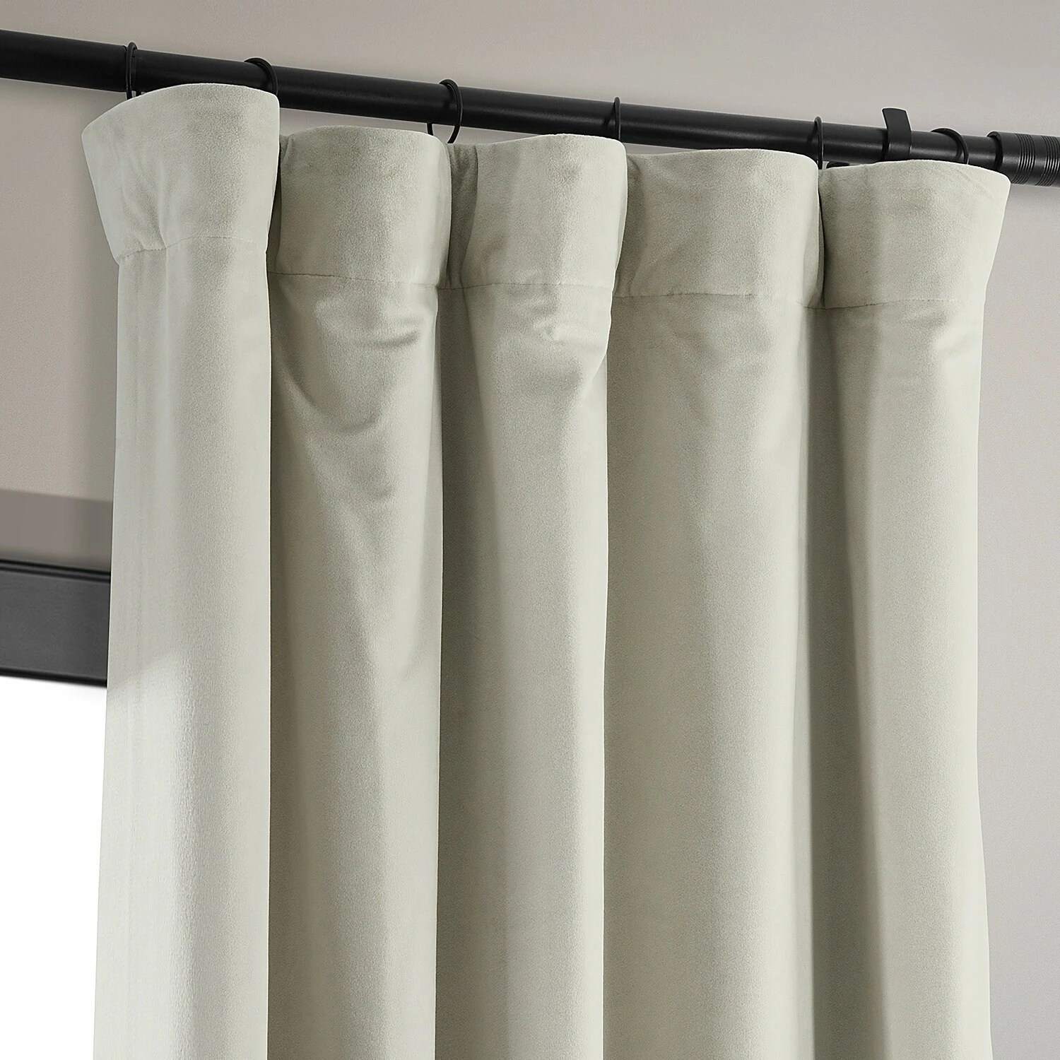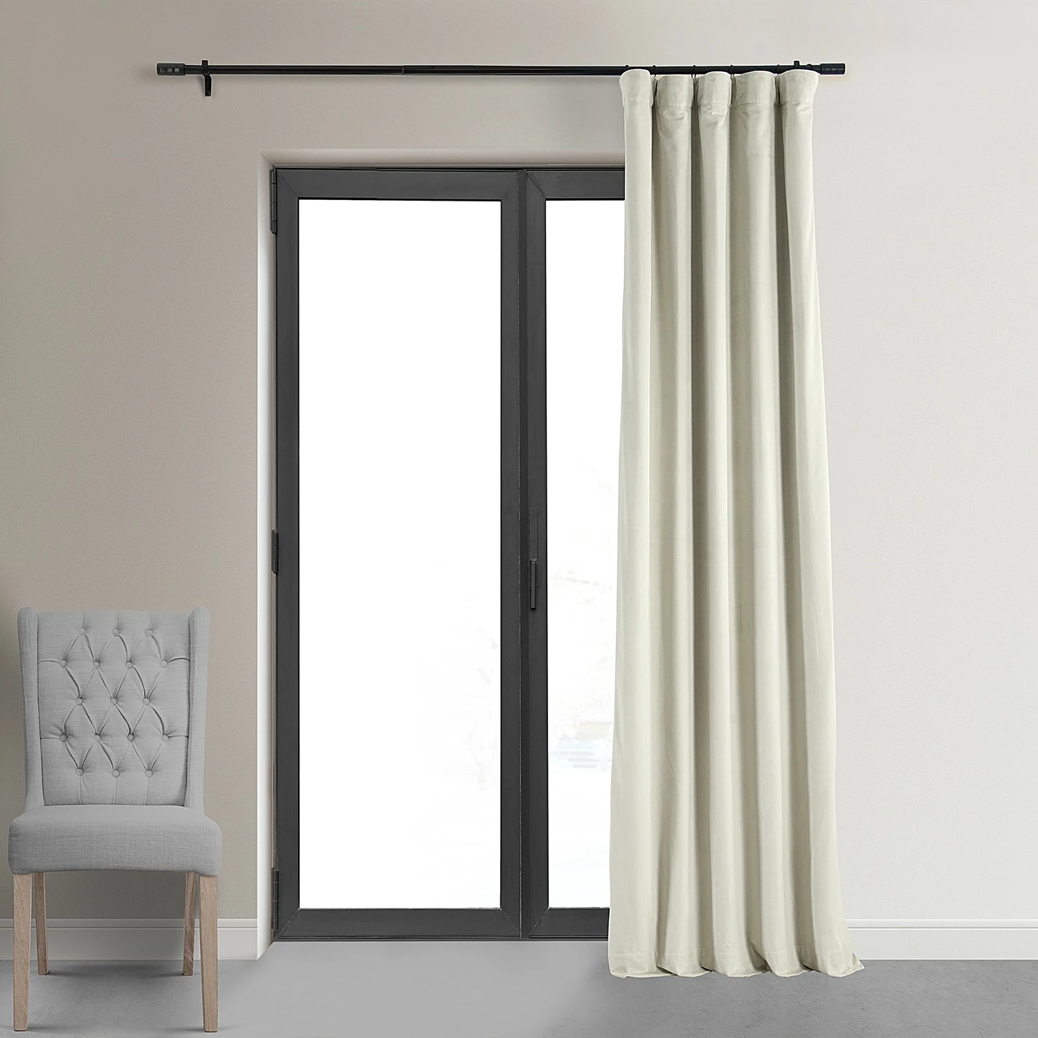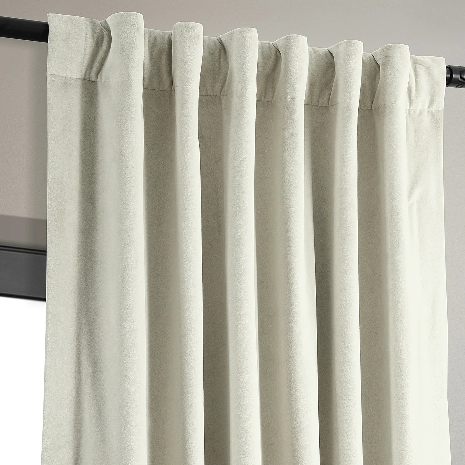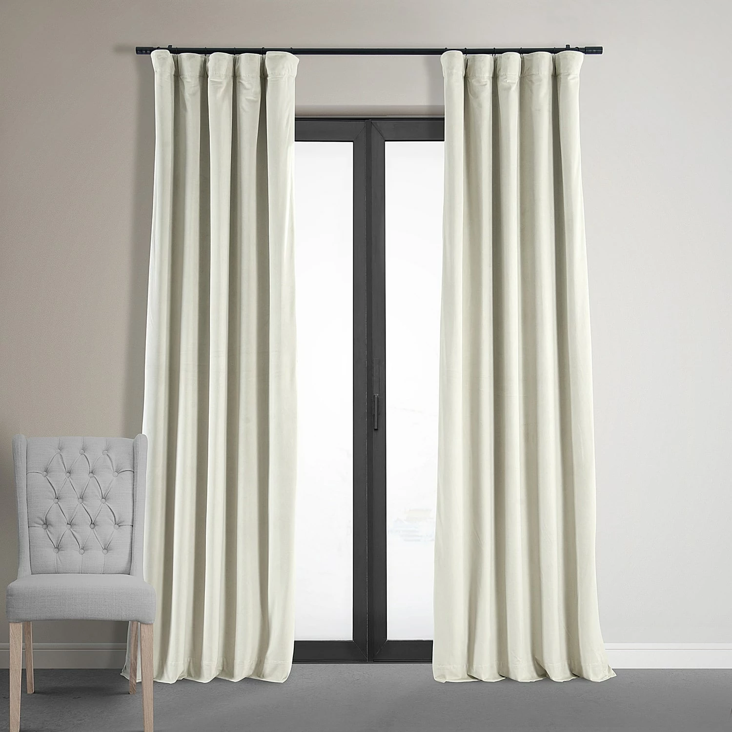 Relax with a midday movie or a lazy Sunday sleep-in with this lovely blackout curtain panel. The elegant off-white color is wonderfully versatile for use in a variety of interiors, and the polyester velvet fabric is resistant to wrinkles for marvelous appeal. Cotton lining lends additional durability and privacy for the optimum blackout use.