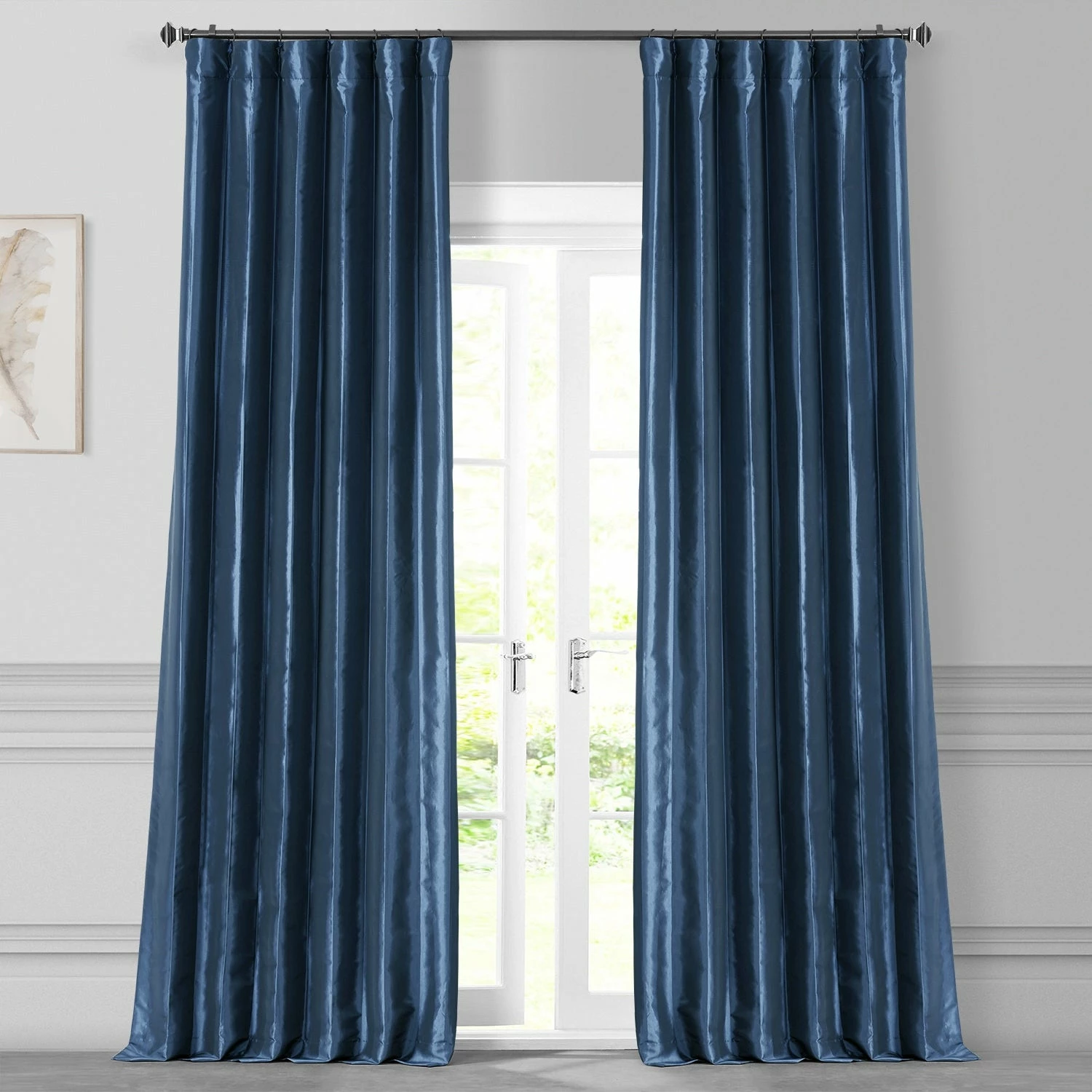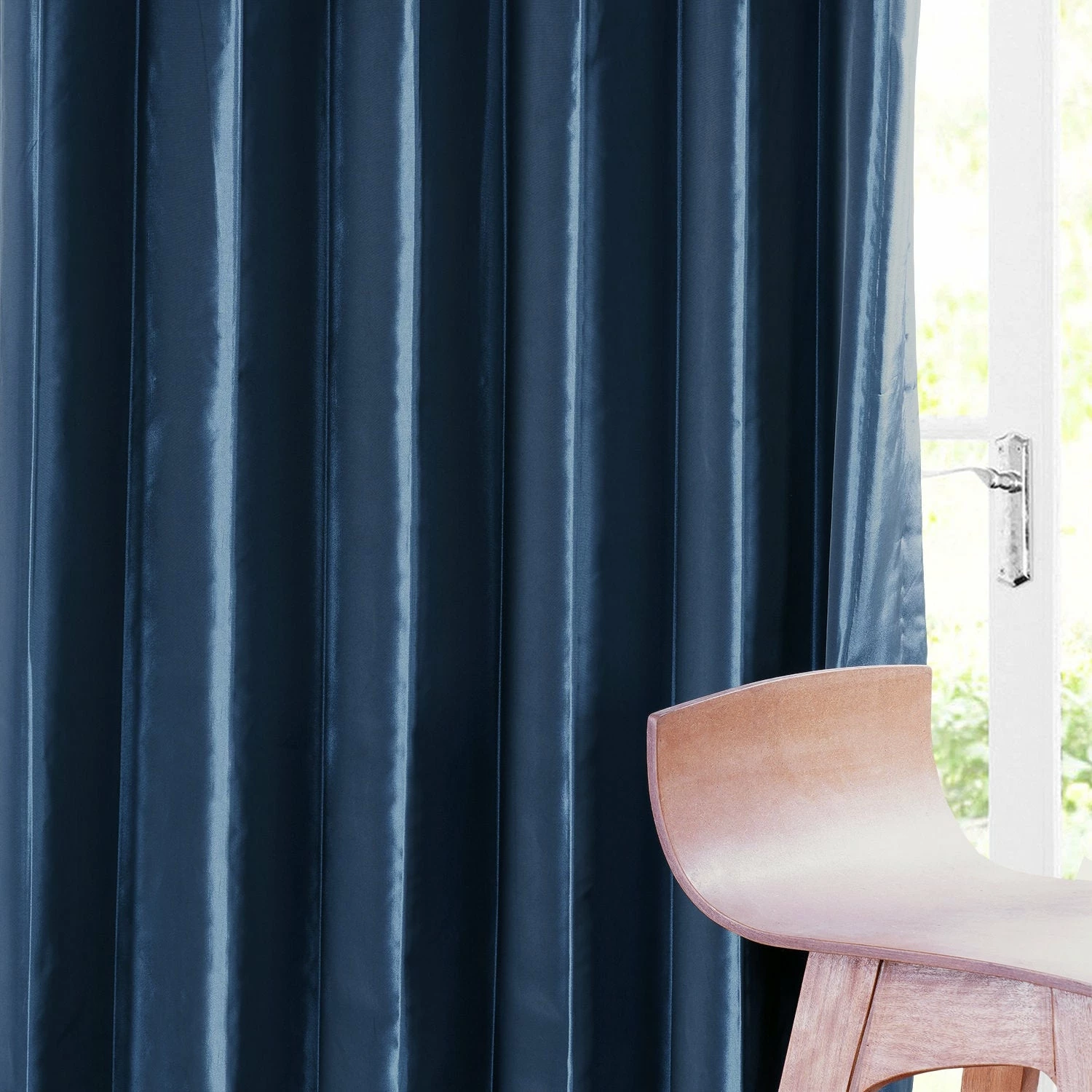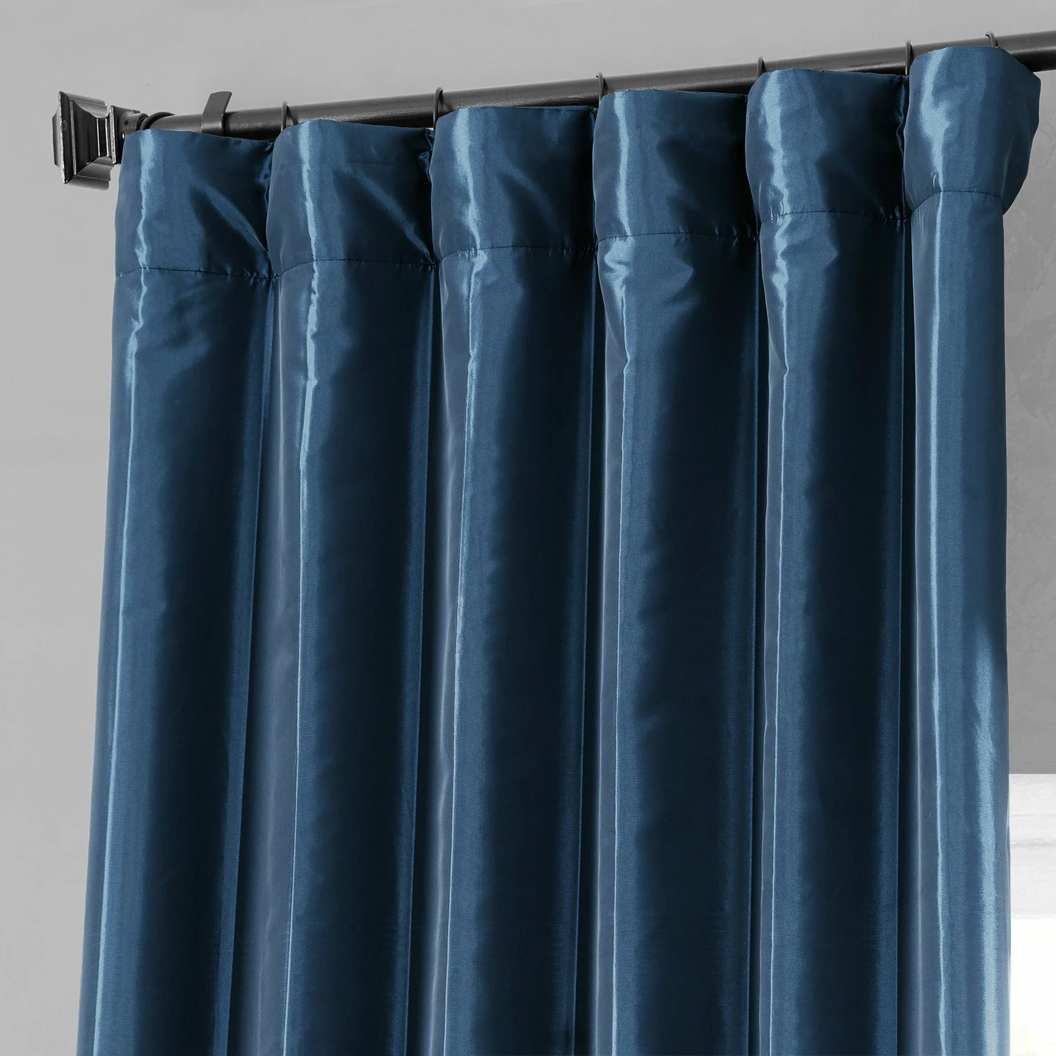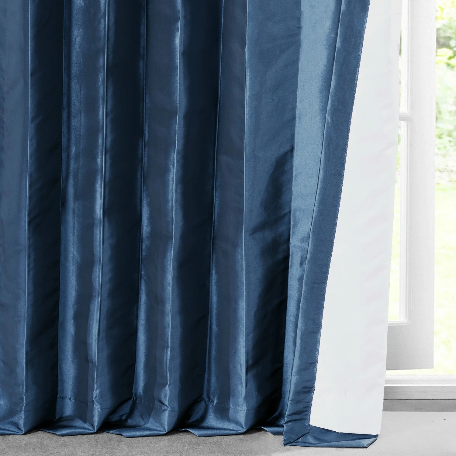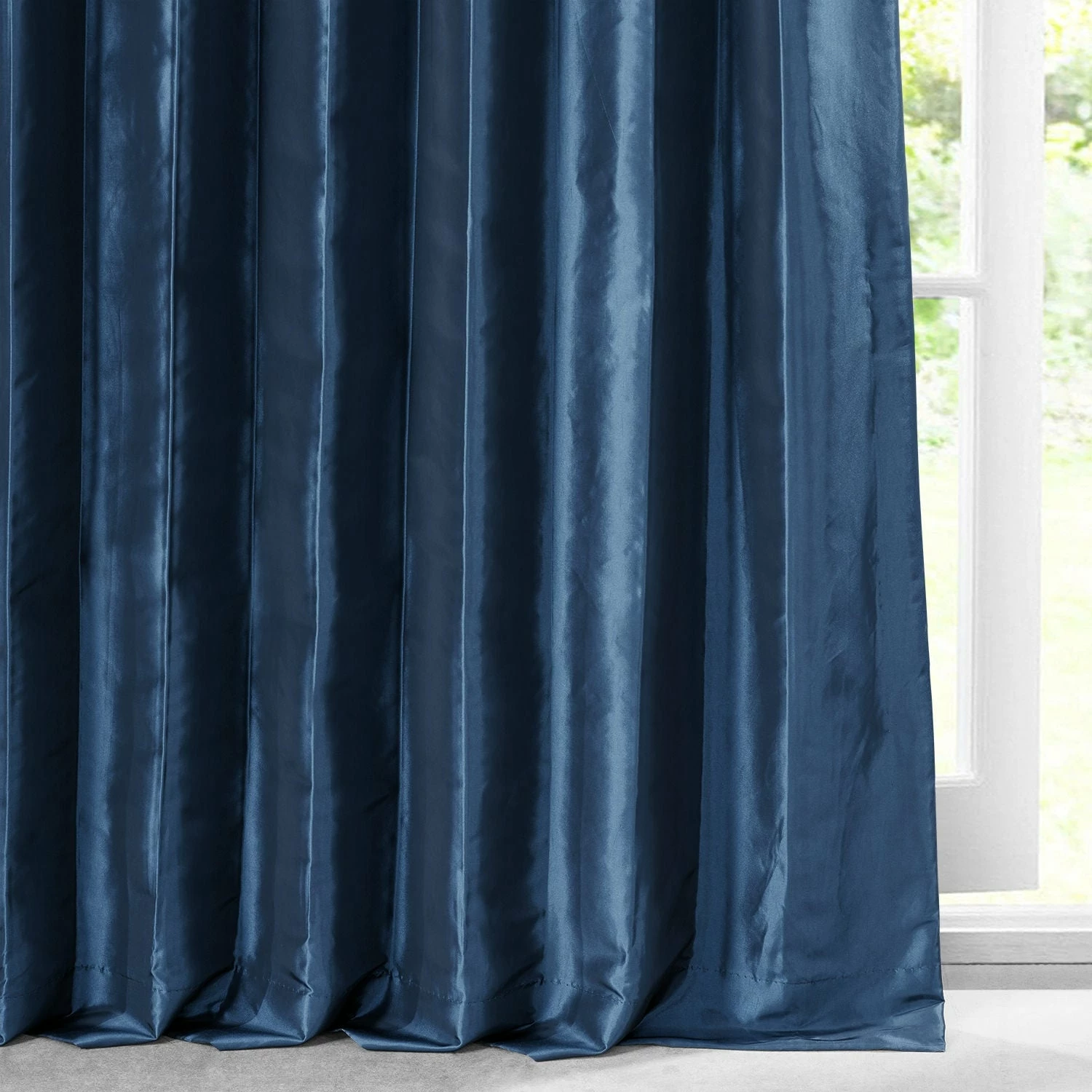 Enrich your living room decor with this faux silk taffeta curtain panel by Exclusive Fabrics. This navy blue window treatment features a cotton lining and a flannel interlining that blocks light for a cozy ambiance, and it provides insulation to keep your room warm and lower your energy costs.