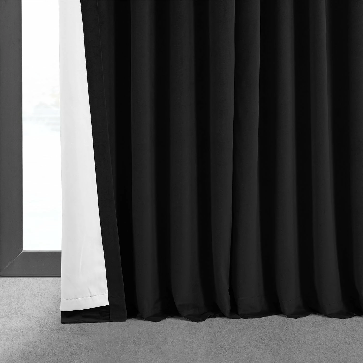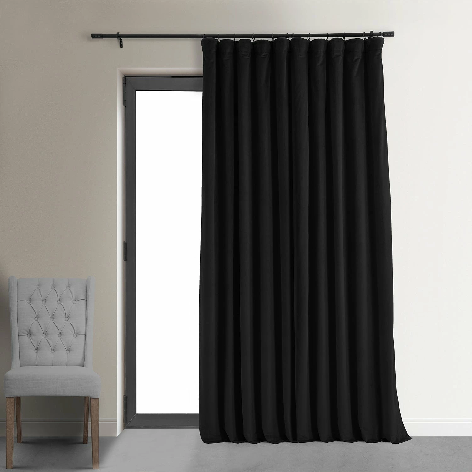Control your lighting with this blackout curtain panel. With a luxurious black velvet outer layer and a light-blocking white lining, this thick curtain helps improve your home’s energy efficiency without sacrificing style. The extra-wide design provides full coverage for large windows, and the panel’s versatile header lets you hang it using clips or a rod.